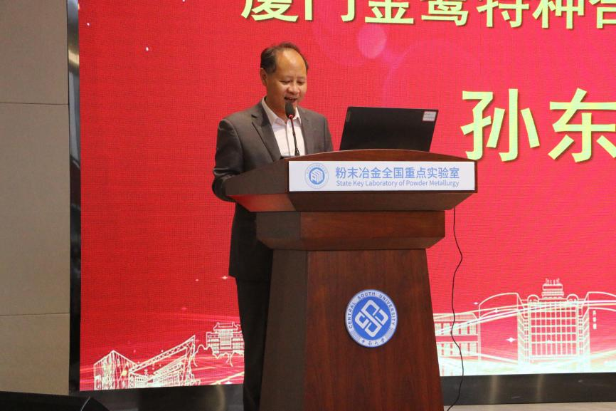 随后,厦门金鹭特种合金有限公司总经理孙东平作为设奖企业代表上台发言。他向获奖师生致以热烈祝贺,并对研究院在粉末冶金领域长期积淀的深厚实力与育人贡献表达敬意。他表示,设立奖励金不仅是对优秀学子的激励,更是企业履行社会责任、助力行业人才培养的重要举措。希望同学们在仰望科技前沿的同时,也能俯身精进实干,把专业学透、把眼界打开,早日成长为支撑行业发展的中坚力量。